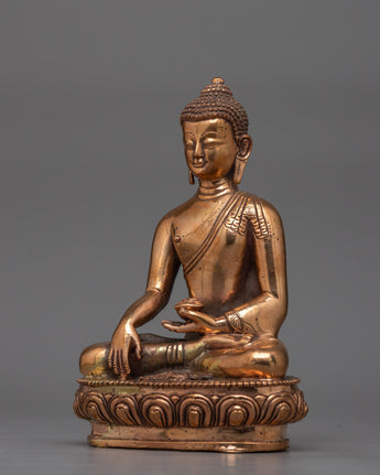 Shakyamuni Buddha's elaborate features are accentuated by the gold plating, which stands for wisdom, serenity, and enlightenment. This sculpture is ideal for meditation areas, altars, or as an elegant ornamental accent piece. It infuses any setting with a feeling of peace and spiritual significance. Accept the ageless elegance and profound spiritual meaning of this exquisitely carved Shakyamuni Buddha, and use its presence to motivate you on your path to knowledge & inner peace.