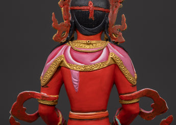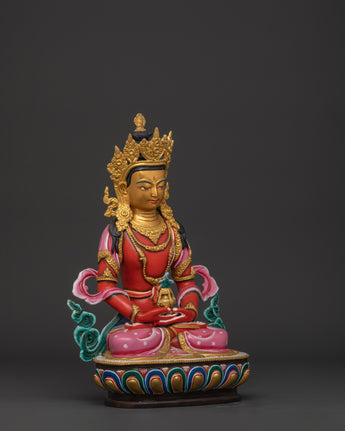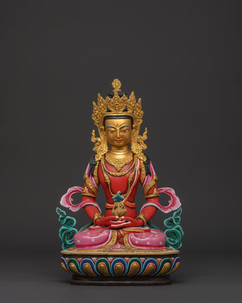 This 31cm sculpture is meticulously crafted with a copper body and colorful, hand-painted acrylic highlights. Its rich red robes, exquisite golden crown, and tranquil facial features show the excellent skill of Himalayan artists. Amitayus holds a vase of amrita (immortal nectar), indicating his ability to cure disease and prolong life. Whether used for daily meditation or as a precious gift, this statue invites eternal blessings and enriches any area with spiritual beauty.