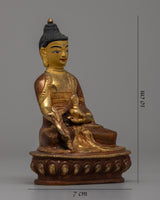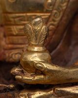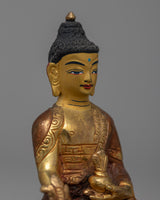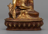 The skillful craftsmanship of this statue perfectly embodies the serene disposition and emblematic features of the Medicine Buddha, including the customary medicinal bowl he holds in his hand. The statue's serene expression is emphasized by the combination of copper and selective gold gilding on the face, which heightens its spiritual presence. The statue's aesthetic appeal is enhanced by the application of 24k gold plating to certain areas, which highlights its sacredness.