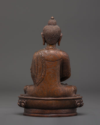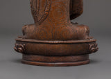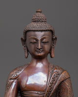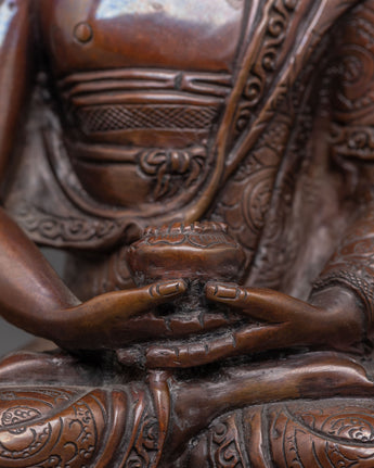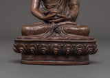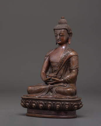 The handmade peaceful statue of Buddha Amitabha stands at 8.3” (21cm) in height, with a base width of 5.5” (14cm), and weighs 1.35 kg. Expertly crafted from oxidized copper, it reflects traditional Tibetan artistry and makes a refined addition to compact altars, meditation spaces, or personal spiritual collections.