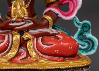 This handmade Tibetan Amitayus statue stands 21 cm tall, 16 cm wide, and weighs 1.34 kg. It is made of copper and hand-painted with amazing acrylic colors. Each detail, from the lotus-petal base to the carefully carved flowing robes, is meticulously portrayed, demonstrating exceptional artisanal expertise. The polished copper shines beneath layers of brilliantly colored acrylic, lending the sculpture a lively, bright aspect.