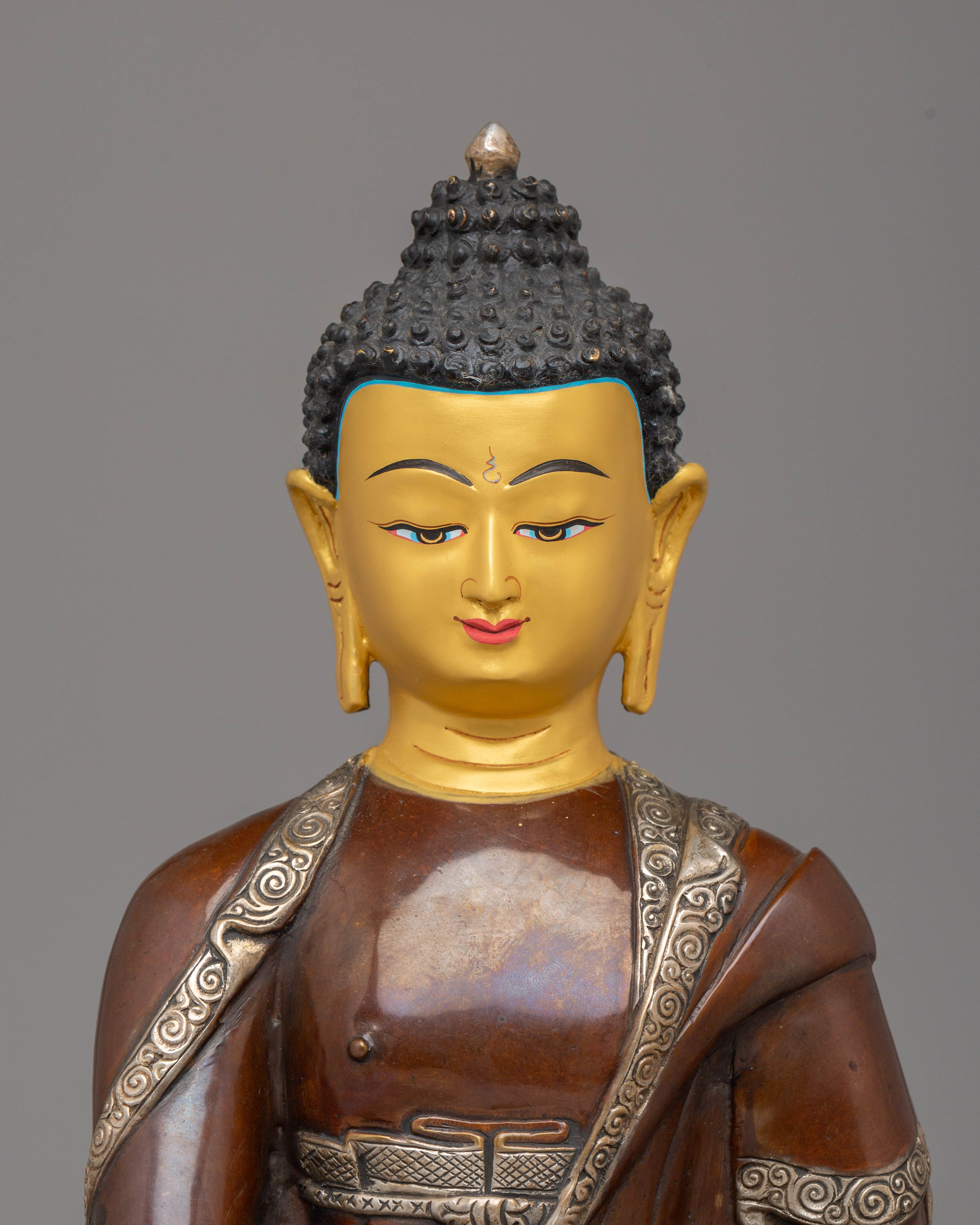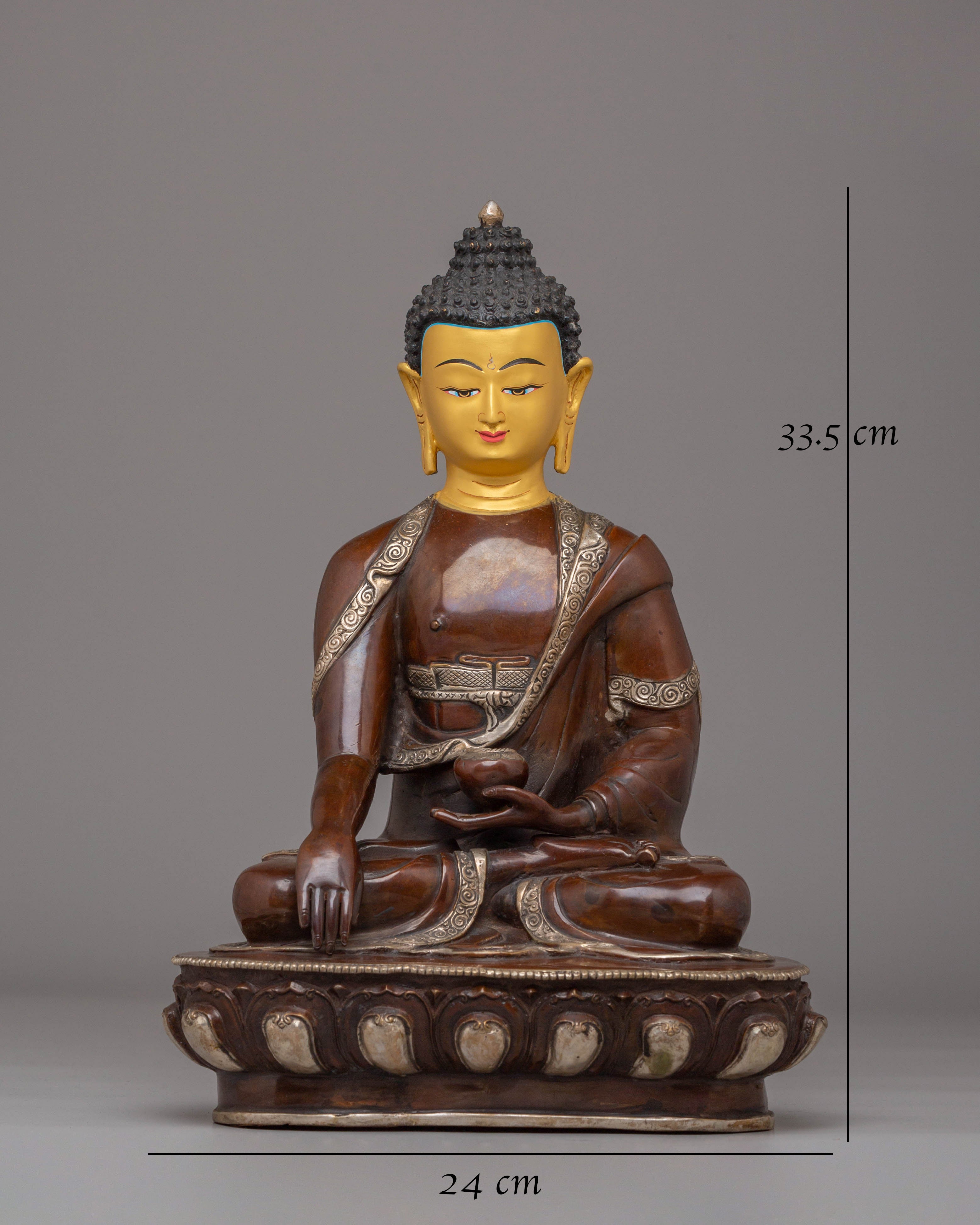 This Historical Buddha Statue of Shakyamuni is a finely crafted piece of art that brings the Buddha's teachings to life. Standing at 33.5 cm in height and 24 cm in width, weighing 3.5 kg, this statue is made of oxidized copper and features electro-silver plating, gold plating, and intricate acrylic color details. The combination of these materials ensures the statue’s beauty while conveying the wisdom and peace that Shakyamuni Buddha represents. This statue is an ideal addition to any Buddhist altar, meditation space, or sacred area, bringing spiritual energy and enlightenment to your home.