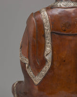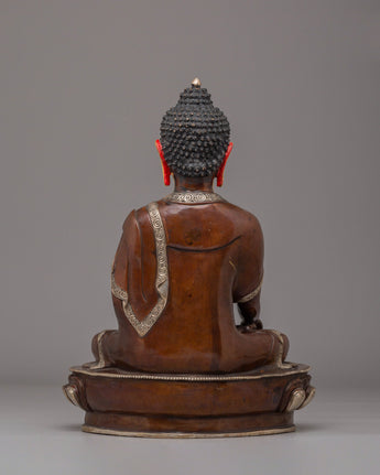 The Shakyamuni Buddha is depicted in a traditional seated position, with one hand held in the gesture of meditation, symbolizing inner peace, tranquility, and the pursuit of enlightenment. The intricate electro silver plating on the robes and gold plating on the crown and jewelry represent the Buddha’s nobility and spiritual wisdom. The detailed acrylic colors enhance the clarity of his serene expression and the flowing robes, bringing life and depth to the figure. The oxidized copper body gives the statue an earthy, grounding feel, reflecting the Buddha’s connection to the material world while promoting spiritual transcendence.