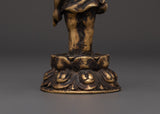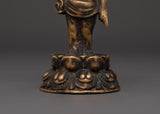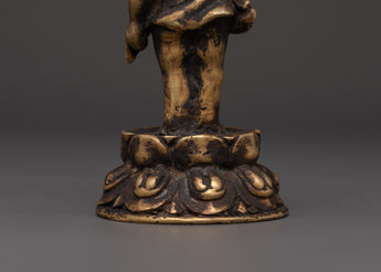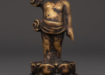 This Infant Buddha Idol in Copper vividly depicts Siddhartha's birth, with the distinctive one-hand-up, one-hand-down position representing his heavenly pronouncement. This compact yet strong figure, measuring 14.5cm in height and 7.5cm in width and weighing only 0.34kg, rests on a lotus pedestal, symbolising purity and spiritual awakening. This sacred sculpture, created from a copper body with a naturally occurring patina, is ideal for personal altars, meditation areas, or as a meaningful gift for Buddhist practitioners and collectors.
