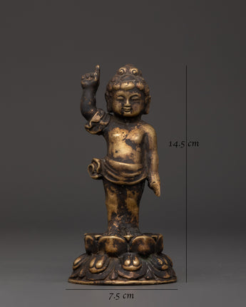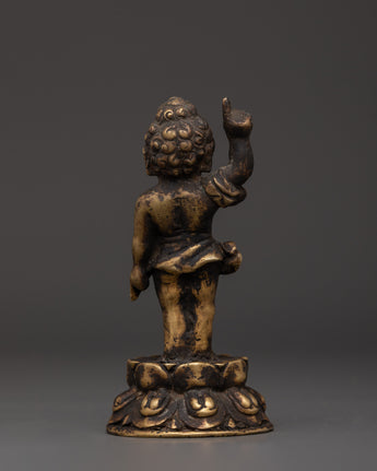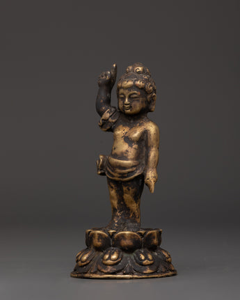 Each aspect of this newborn Siddhartha statue is meticulously made, symbolizing reverence for his enlightened destiny and the moment he took his first seven steps. The copper finish has an old, spiritual quality that pairs well with both classic and contemporary settings. This infant Buddha idol, with its rich symbolism and divine presence, is a valuable addition to your spiritual collection or shrine. Add this Buddhist birth statue, enlightenment stance décor, and copper baby Buddha sculpture to your sacred place to celebrate Dharma's roots.