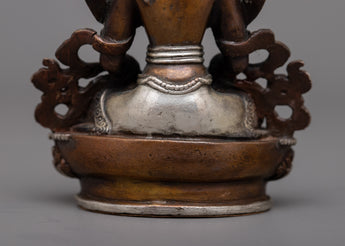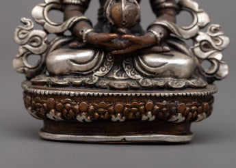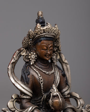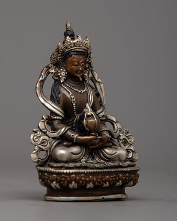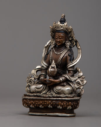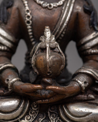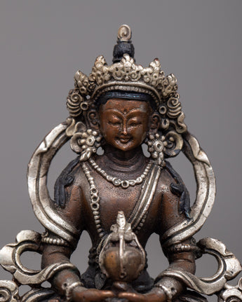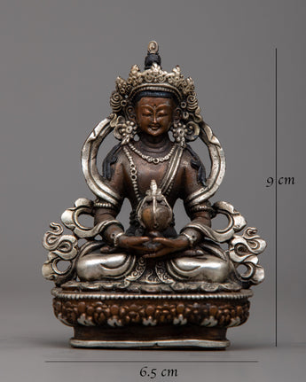 The machine-made Long Life Amitayus Buddha Statue is a representation of health, longevity, and happiness. It is made with great attention to detail. This statue exudes grace and tranquility, with its oxidized copper body and silver-plated finish. Measuring nine centimeters in height, it embodies the spirit of Amitayus, the Buddha of Infinite Life.