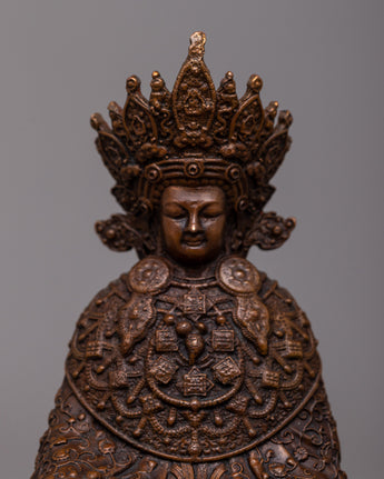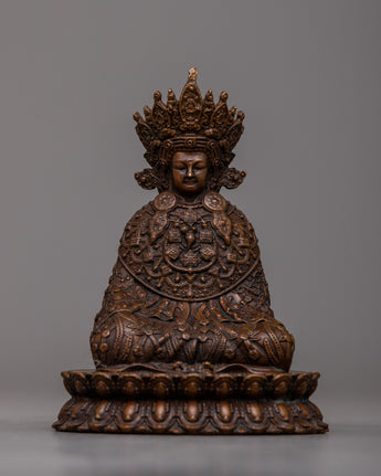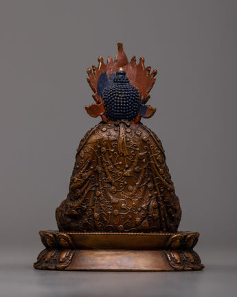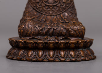 The Lord Buddha Statue, with its exquisitely crafted features and noble stance, is a focal point for reflection and respect in any hallowed place or domestic altar. Its small size allows it to be displayed in a variety of contexts, and its oxidized copper body gives it an air of authenticity and antiquity. This machine-made statue invites practitioners to connect with the everlasting teachings of Lord Buddha by providing a concrete symbol of serenity, compassion, and enlightenment, whether it is utilized for personal meditation or as a decorative accent.
