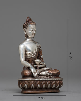 Presenting our Shakyamuni Buddha Statue, crafted by Lord Machine, an exquisite representation of peace and wisdom. This statue, which is meticulously crafted with a silver coating and an oxidized copper body, perfectly depicts the Buddha Shakyamuni's compassionate demeanor. Reaching 9.5 cm in height, every detail of the statue is carefully crafted, embodying the profound teachings of the Buddha.