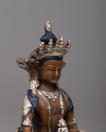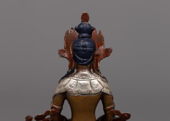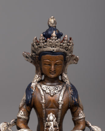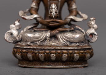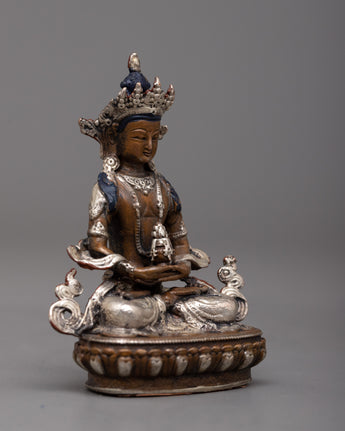 The 6.5-cm-tall Machine-Crafted Amitayus Buddha Statue has a body made of oxidized copper and is beautifully plated in silver. Often referred to as the Buddha of Infinite Life, Amitayus is seen in a calm pose, exuding longevity and compassion. The statue represents the desire for a long, fulfilling life that is full of enlightenment and spiritual development.