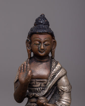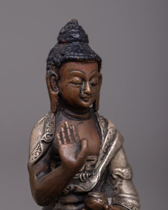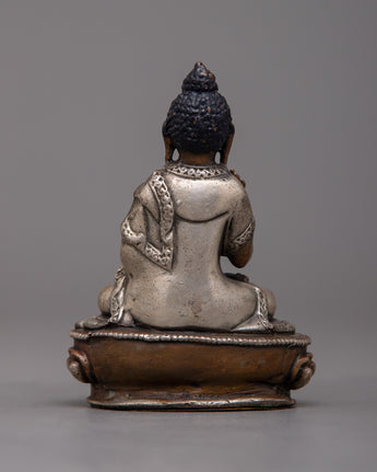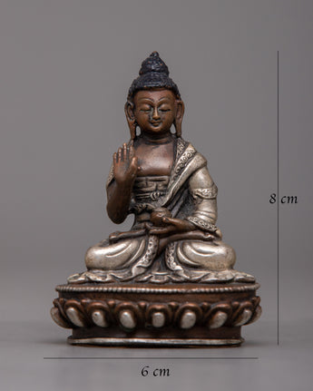 The 8-cm-tall Machine Molded Amoghasiddhi Buddha Statue symbolizes the enlightened attributes of bravery and achievement. This sculpture, which was created by a machine on a body of oxidized copper and then finished with silver plating, represents the spiritual essence of Amoghasiddhi.