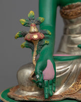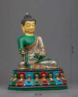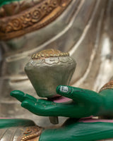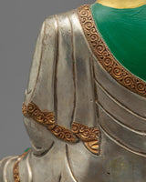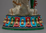 The Buddhist medicine buddha is carved up of a copper body with acrylic paint. At the face, the shining paint is done to show the buddha's charm and calm expression. The Buddha is portrayed sitting on the lotus base. The deity is carrying the medicine nectar in his left hand and the right hand resting on his right knee, holding the stem of the Aruna fruit. The robe Is silver plated.