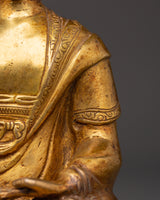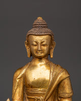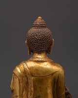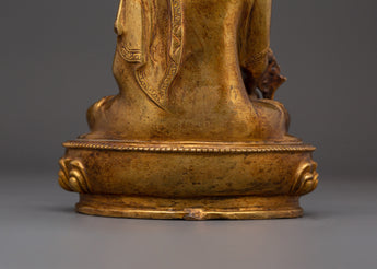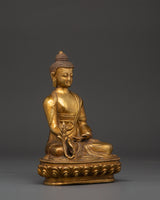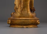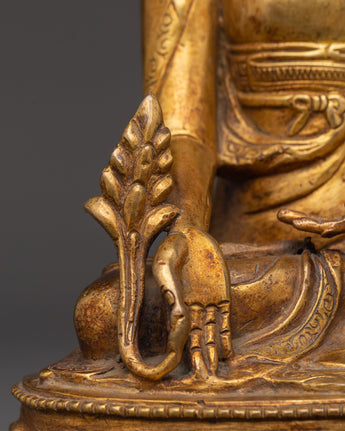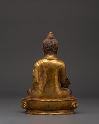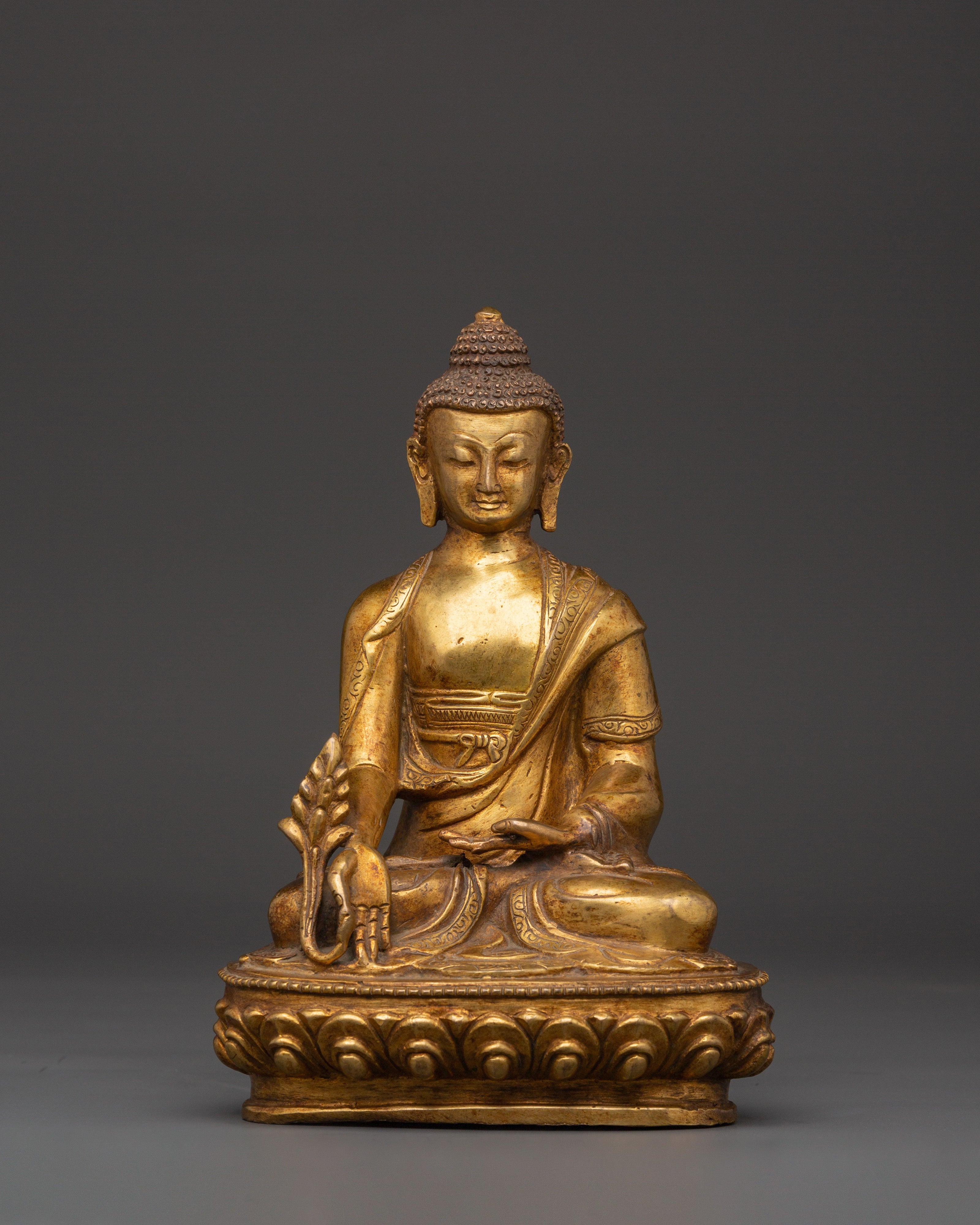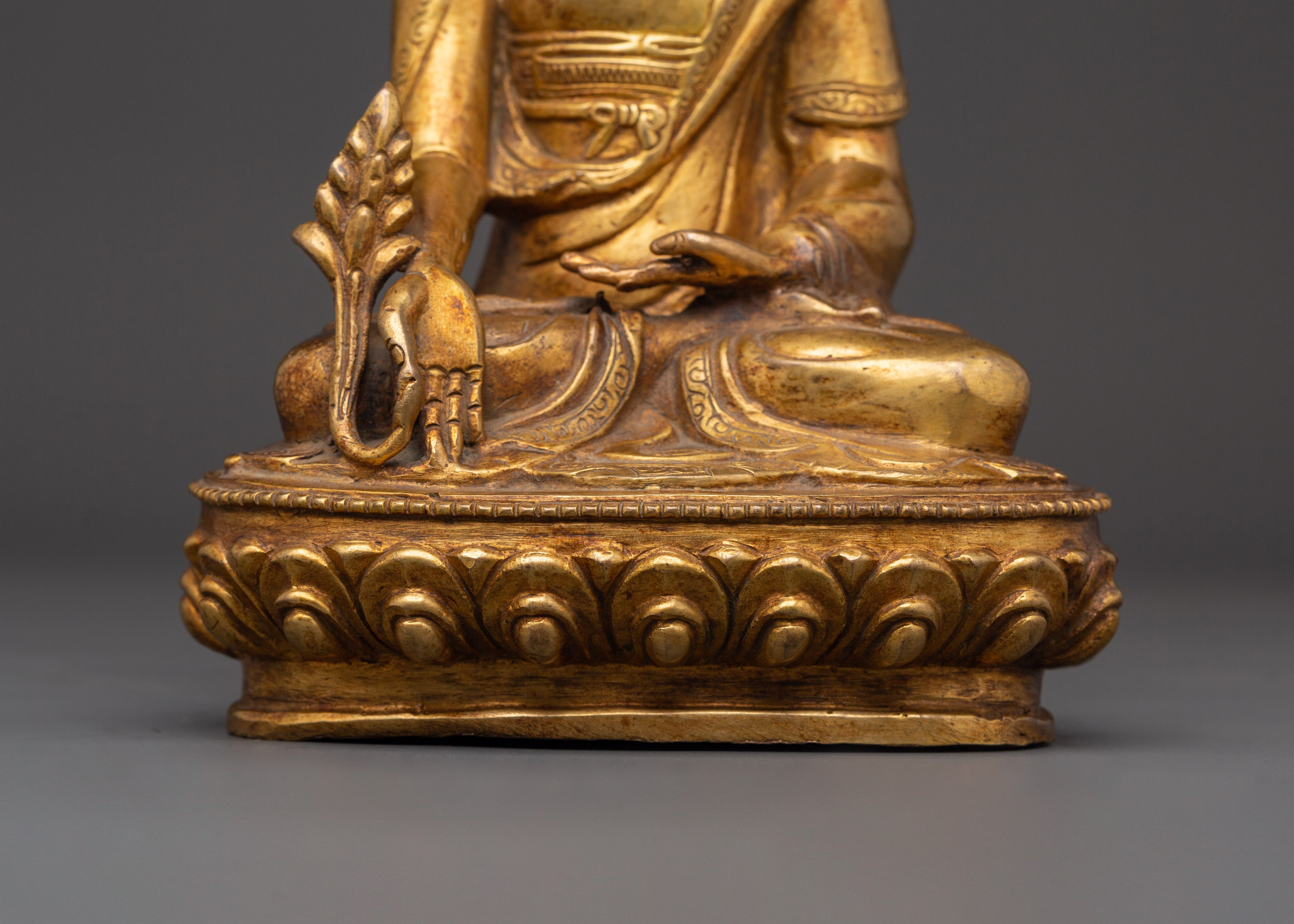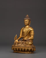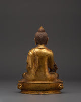 Introducing our "Medicine Buddha" statue, an amazing depiction of the Buddha of Healing. This statue, standing 21 cm tall and weighing 1.48 kg, is crafted of copper and plated with gold. Medicine Buddha's tranquil expression, meditative stance, and the symbolic bowl he holds, which represents profound healing and compassion.