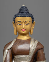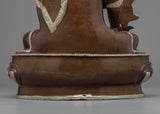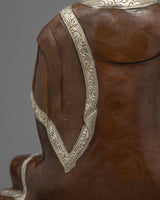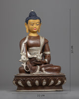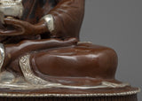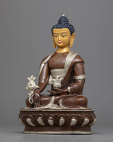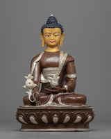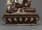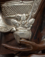This stunning Medicine Buddha Mantra Practice Statue depicts Buddha's serene face and was handcrafted from copper before being plated with silver for a striking and elegant appearance. The Buddha's face is adorned with gold gilding, lending the piece opulence and beauty. The Buddha is depicted sitting on a lotus base, which is a traditional Buddhist symbol of purity and spiritual awakening. The statue is significant and valuable to those who practice Buddhism or seek to cultivate a sense of inner harmony and balance because it represents the enlightened mind and the path to inner peace.