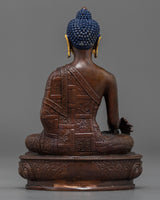 Traditionally sculpted small statue of the Medicine Buddha Art made in Nepal with precision by machine with a copper body and gilded face with genuine 24k gold. The statue is depicted with a calm expression sitting in a cross-legged position upon a lotus and is holding an alms bowl in his left hand and forming a Gyan mudra in his right hand. It is believed that placing one in a house grants the family increased healing powers as well as warding off negative powers.