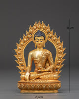 Shakyamuni Sculpture captures the serene essence of enlightenment in a beautifully crafted seated pose. Made from a copper body and enhanced with elegant gold plating, The figure rests on a beautifully crafted lotus pedestal, surrounded by an elegant halo frame adorned with traditional Buddhist motifs that represent radiance and spiritual purity. At 11cm tall, 8.5cm wide, and weighing 0.22kg, this small but spiritually powerful statue is perfect for personal shrines, meditation spaces, or as a meaningful spiritual gift. Its handcrafted detail and symbolic posture bring mindfulness, presence, and reverence to any space it occupies.