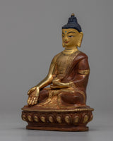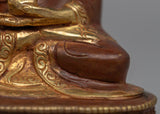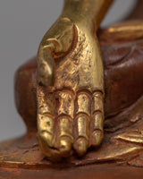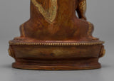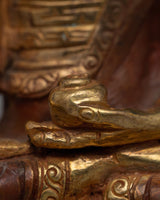 Ratnasambhava Buddha composed demeanor and serene expression are beautifully rendered in this statue by the artist. Durability is ensured by the base material's use of copper, and the statue's fine details are highlighted by gilding and selective 24k gold plating, which produces a play of texture and light. The work of art has a feeling of serenity and reverence because of the deliberate material combination.