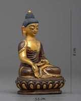Let your senses be captivated by the Namo Ratna Sambhava Statue as it elevates your spiritual journey. Measuring 8 cm in height, this remarkable work of art is a representation of spiritual grace. It is painstakingly crafted from a copper body, lavishly gilded in 24k gold, and enhanced with an enthralling acrylic painting.
