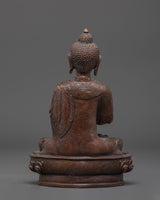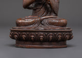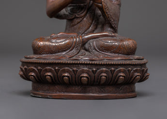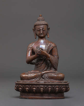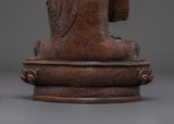 This oxidized copper handmade Vairocana sculpture captures the cosmic essence of the primordial Buddha, embodying universal truth and transcendental wisdom. This statue is made up of an oxidized copper body. Seated in padmasana (lotus posture), Vairocana emanates calm and boundless awareness, radiating the light of dharma to all realms. His serene expression and meditative stance invite a sense of inner stillness and clarity, making this statue a powerful addition to any spiritual altar or meditation space.