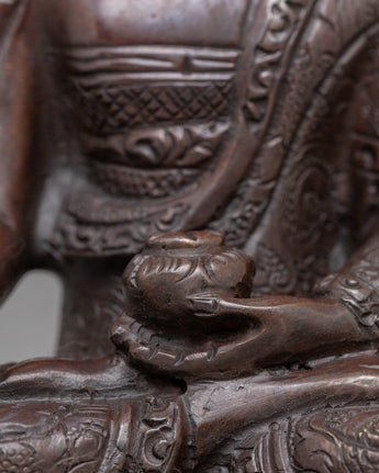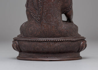 This Peaceful Jewel-born Buddha Ratnasambhara statue measures 16 cm in height and 10.5 cm at the base, weighing 0.61 kg. Crafted from oxidized copper, this statue represents Ratnasambhara, the Buddha of wealth and prosperity. Known for bestowing riches and good fortune, Ratnasambhara is revered for his compassionate nature and ability to grant material abundance and spiritual blessings. Expertly handcrafted by skilled artisans, this statue is a beautiful addition to altars, meditation areas, or sacred spaces, inviting prosperity and peace into your home or practice.