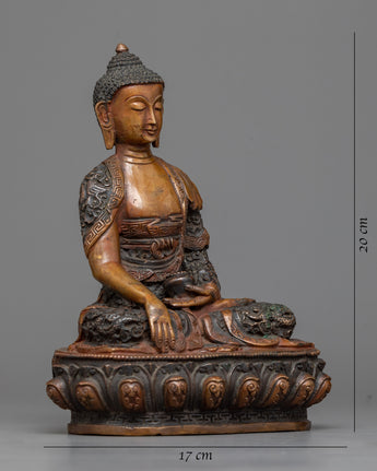 This Shakyamuni Buddha Statue, measuring 20cm, is perfect for creating a peaceful sanctuary in your home or office. It is appealing to those seeking a sense of spiritual calm, collectors of Buddhist art, and anyone who appreciates the beauty of handcrafted, oxidized copper statues.