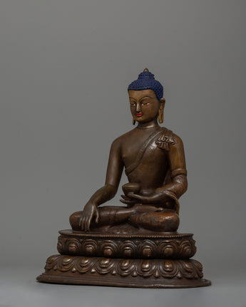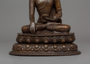 The statue's base features intricate designs, including the traditional lotus pedestal, representing purity and spiritual enlightenment. The oxidized finish on the copper body highlights subtle browns, giving the figure depth and a timeless quality. The Oxidized Copper Shakyamuni Buddha Statue is a stunning depiction of spiritual tranquillity, perfect for meditation spaces, altars, or as a meaningful decorative piece. Its craftsmanship and spiritual symbolism distinguish it from other pieces in any collection.