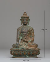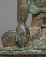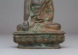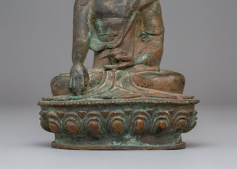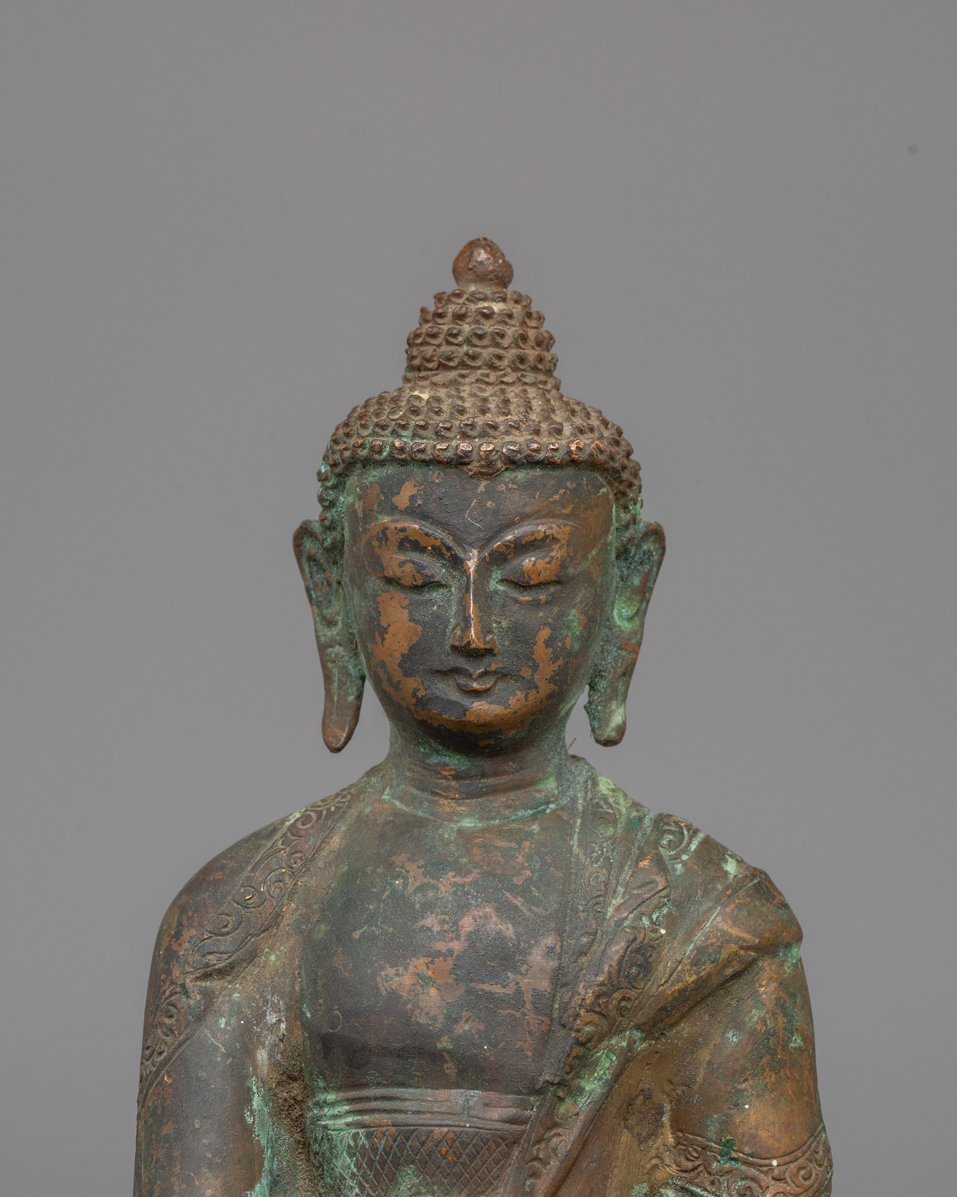 Shakyamuni Buddha is depicted sitting in the lotus pose (padmasana), indicating his steady concentration and mastery over the distractions of the material world. His right hand stretched toward the earth in bhumisparsha mudra represents his moment of enlightenment, inviting the earth to witness his waking. The left hand, lying gently in his lap in dhyana mudra, depicts the profound state of meditation and mindfulness that leads to insight and clarity.