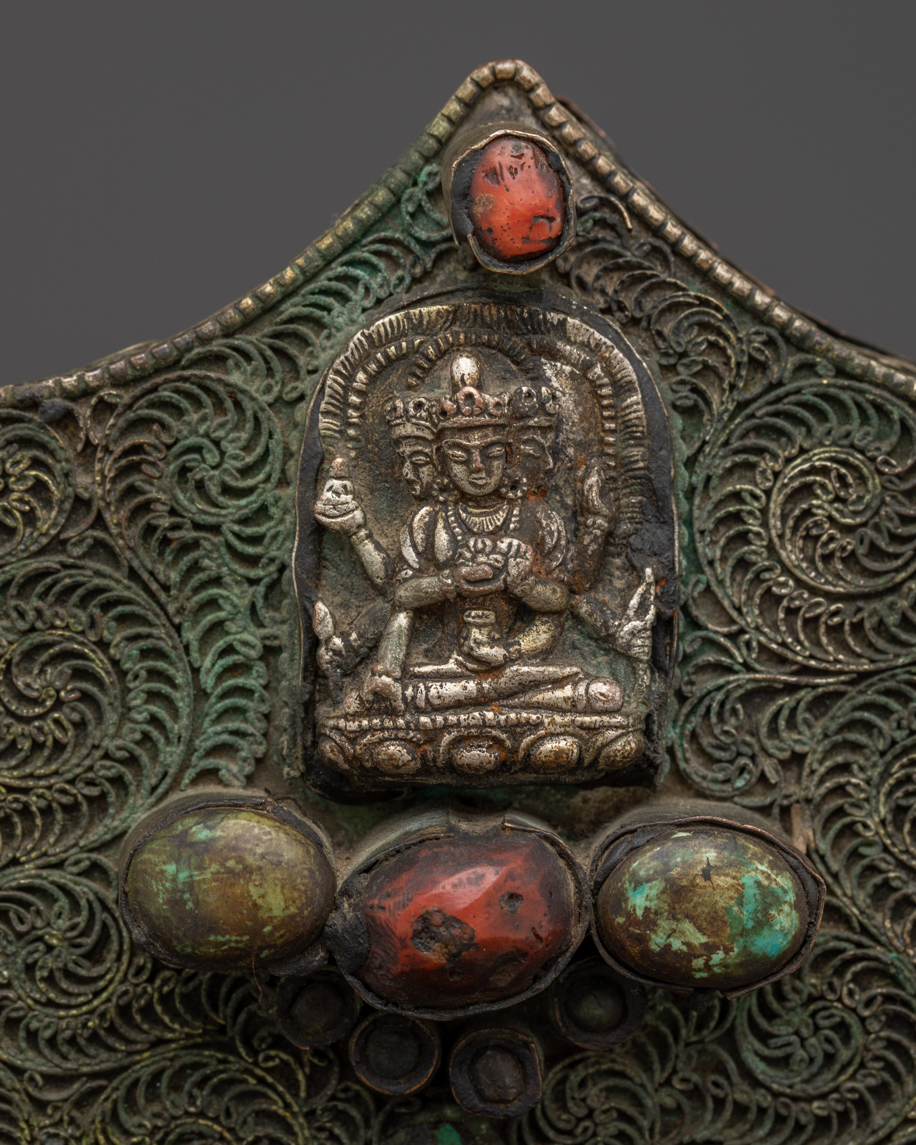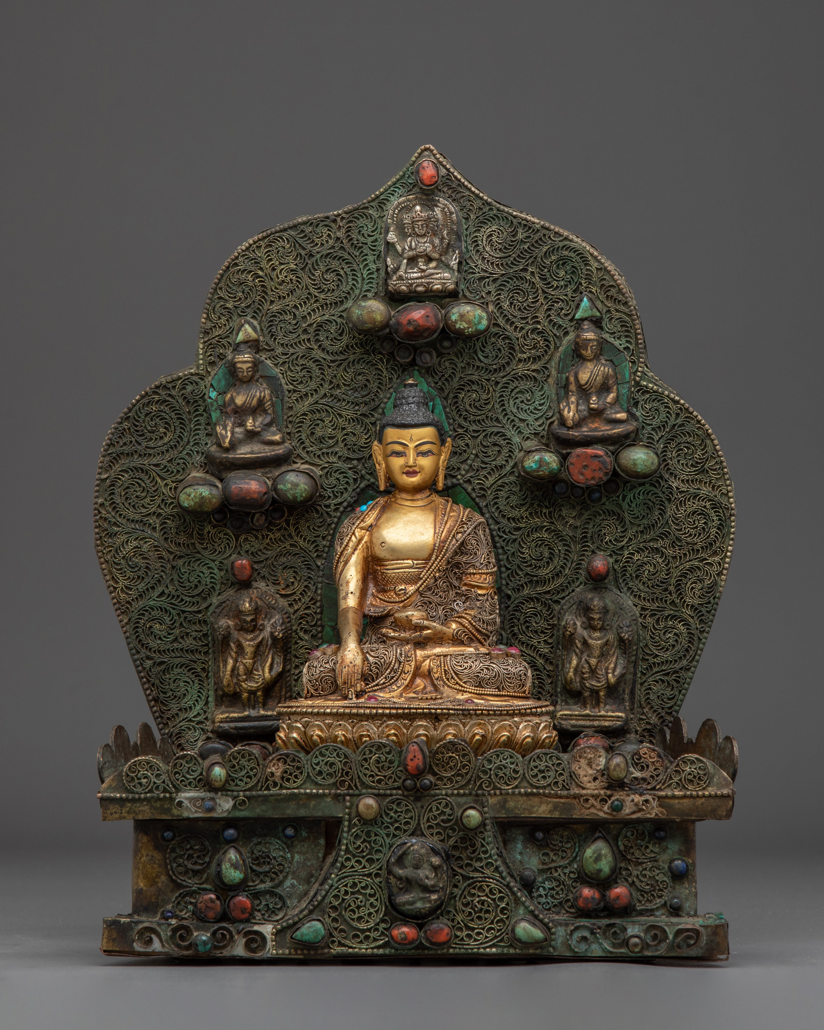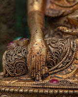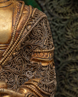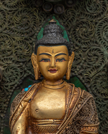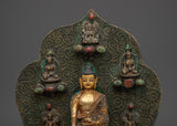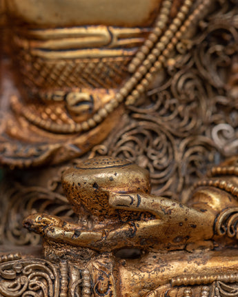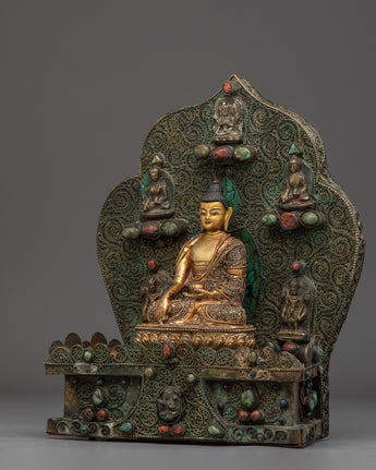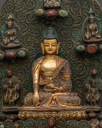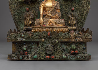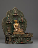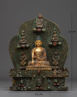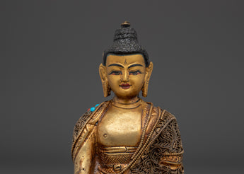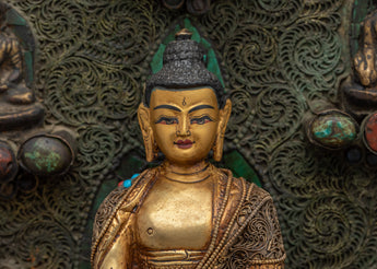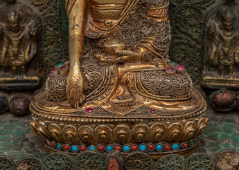 Smaller deities surround Shakyamuni Buddha, each beautifully crafted to symbolize different parts of Buddhist teachings. These deities represent many virtues, including compassion, knowledge, and protection. Together, they intensify the sculpture's spiritual energy, resulting in a peaceful and contemplative ambiance. This Peaceful Shakyamuni Buddha Sculpture is ideal for meditation rooms, altars, or any sacred location, as it raises the energy of the surroundings and inspires a deeper connection to Buddhist practice.