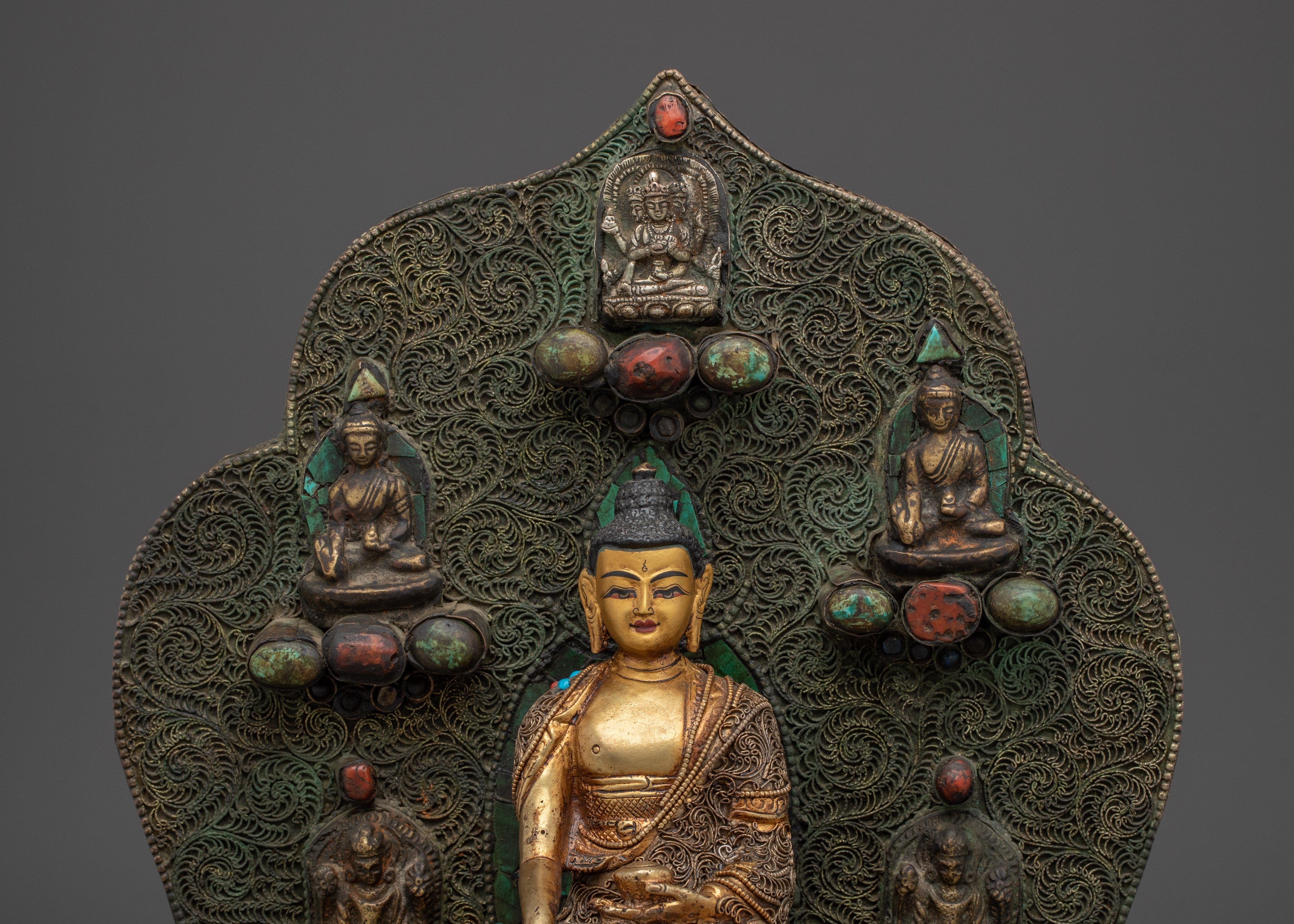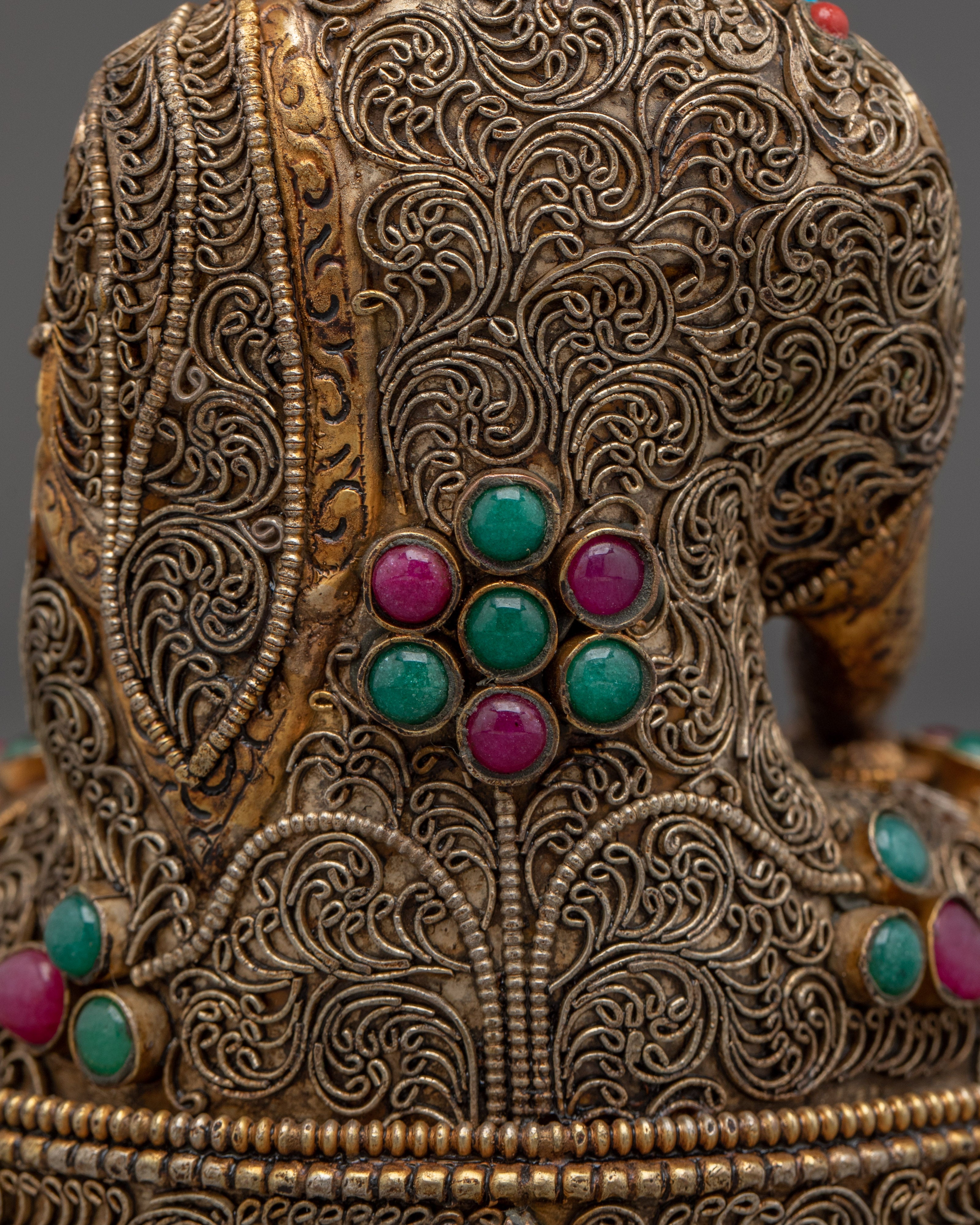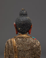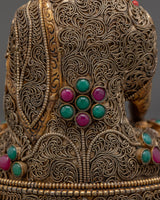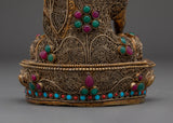 This Peaceful Shakyamuni Buddha Sculpture captures the serene essence of the Buddha in a seated meditative pose, symbolizing wisdom, tranquility, and spiritual enlightenment. Measuring 39cm tall and 24cm wide, it is intricately crafted with a copper body plated in gold, adorned with coral and turquoise artificial stones. The detailed filigree work highlights the delicate facial expression and the robe's flowing folds, creating a calm, sacred ambiance. Perfect for meditation spaces or as a thoughtful gift, this sculpture invites peaceful energy and mindfulness into any setting.