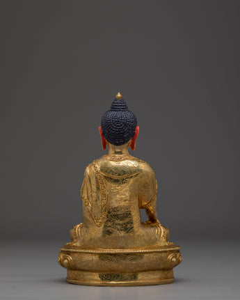 This handmade, radiant golden statue of Shakyamuni Buddha measures 8.3 inches (21 cm) in height and 5.5 inches (14 cm) at the base, weighing 1.27 kg. Expertly crafted from copper and adorned with 24K gold gilding, gold, and acrylic paintings, this statue showcases the refined craftsmanship of skilled Nepali artisans. Its radiant appearance and balanced proportions make it a meaningful addition to any meditation space, home altar, or peaceful interior, offering a sense of calm and spiritual presence.