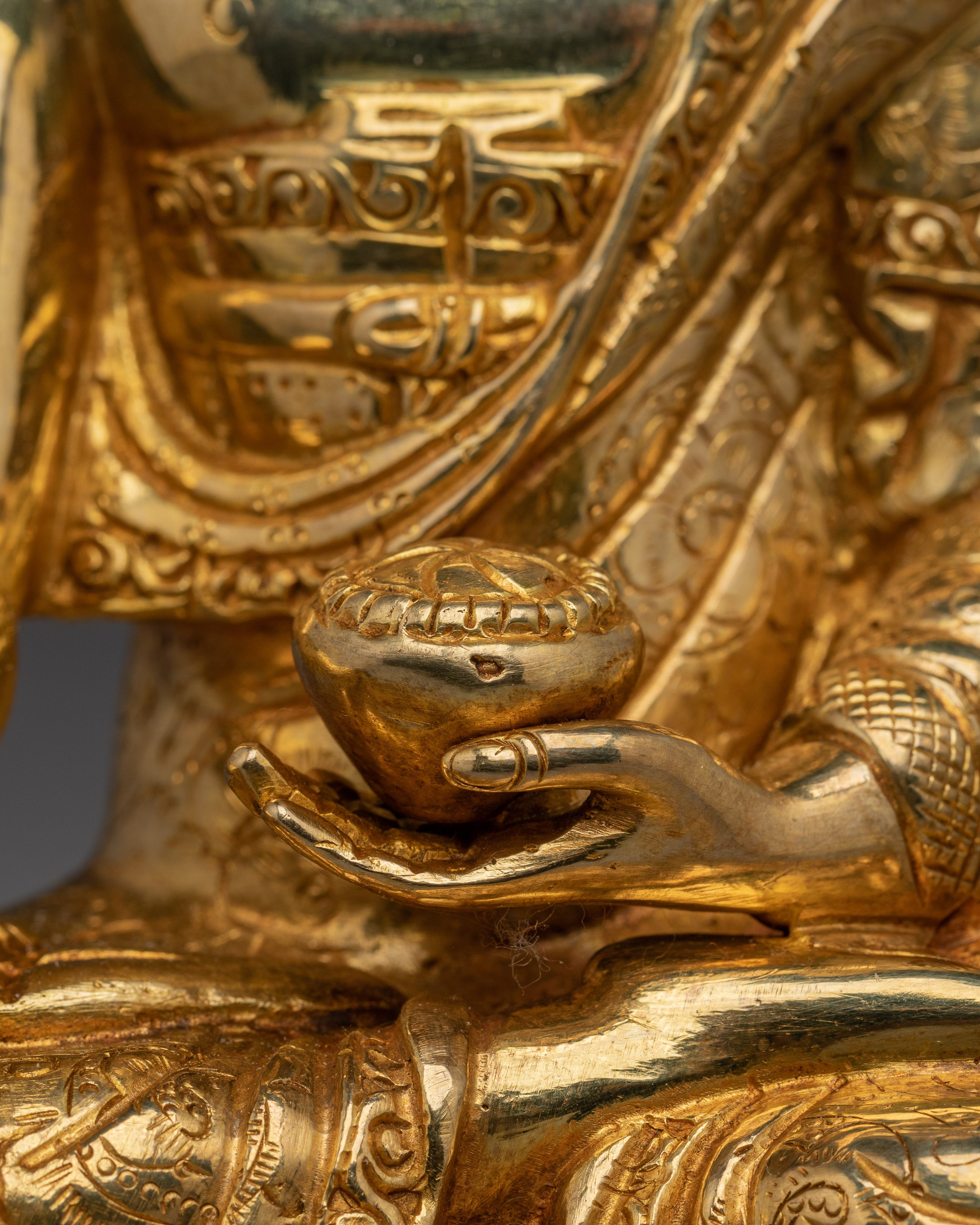 Poised elegantly in the diamond vajrasana posture, the Medicine Buddha sits atop a lotus base adorned with a moon disc—emblems of purity, spiritual elevation, and unwavering strength. In his left hand rests an alms bowl filled with a sacred healing elixir, believed to soothe all ailments and suffering, highlighting his extraordinary power to heal both body and spirit. Clutched in his right hand is the myrobalan plant, a revered herb in Buddhist and Ayurvedic traditions, symbolizing his role as the ultimate healer who brings inner harmony. This revered figure encourages us to cultivate compassion and dedicate ourselves to alleviating the suffering of all beings.