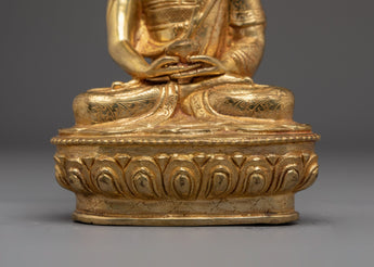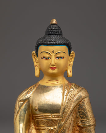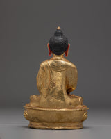 This Serene Radiant Statue of Amitabha Buddha measures 8.3” (21cm) in height and 5.9” (15cm) at the base, weighing 1.23 kg. Crafted from a copper body and beautifully adorned with 24K gold gilding, gold, and acrylic paintings, this statue exemplifies the skilled craftsmanship of Nepali artisans. Its calm presence and elegant design make it a perfect addition to meditation spaces, altars, or spiritual collections.