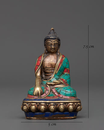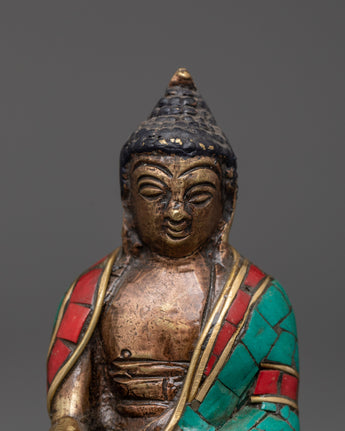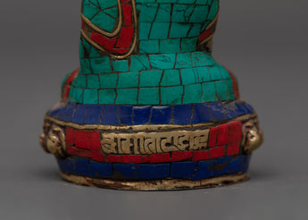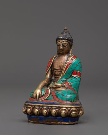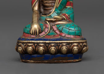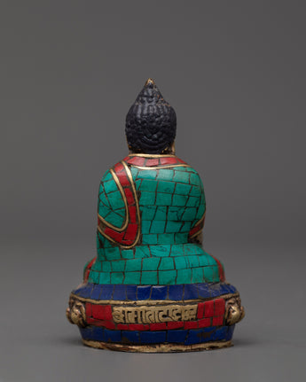 This copper statue is carefully inlaid with shining artificial stones such as coral, turquoise, and lapis lazuli, which allow depth and symbolic color. Every detail, from the meditative position to the delicate facial expressions, highlights the artist's expertise and dedication. This statue is ideal for practitioners, collectors, and those looking to create a spiritual ambiance. It is a symbolic connection for reflection, inner serenity, and Buddha's teachings.