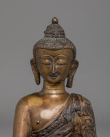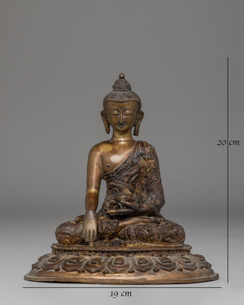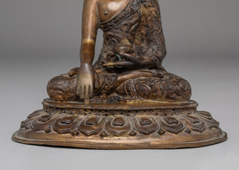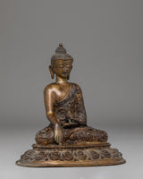 Shakyamuni Buddha is depicted in the padmasana (lotus) posture on a lotus base, wearing traditional robes. His right hand is in bhumisparsha mudra, symbolizing enlightenment, while his left hand holds an alms bowl, representing generosity and spiritual discipline. The ushnisha atop his head signifies wisdom and spiritual awakening, completing this classic and inspiring representation.