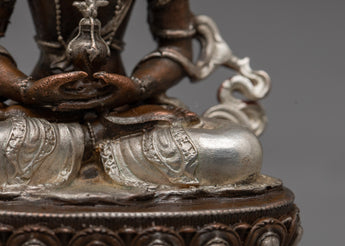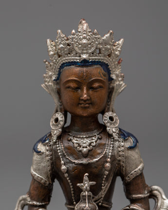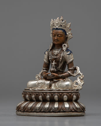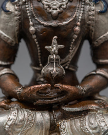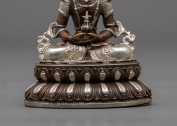Introducing the magnificent statue of the seated Amitayus Buddha, a pinnacle of peace and enlightenment. This exquisitely crafted statue, which exudes calm and spiritual harmony, displays the sublime grace of Amitayus Buddha on an oxidized copper body. This machine-made masterpiece, which stands as a sign of longevity and spiritual vigor, has an electro silver-plated finish that highlights every minute detail with a radiant brightness.
