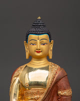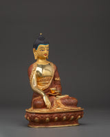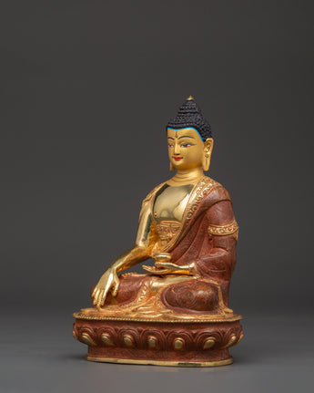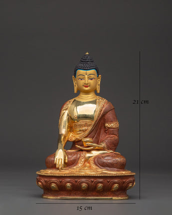 This magnificent statue portrays the Shakyamuni Buddha's profound peace and wisdom. This portrayal of Siddhartha Gautama, who reached enlightenment under the Bodhi tree, stands 21 tall, weighs 1.05 kg, and exemplifies the Buddha's transforming journey. Crafted from a copper body, the statue is embellished with gold gilding and meticulous acrylic paintings, creating a work that exudes The Enlightened One's radiant energy.