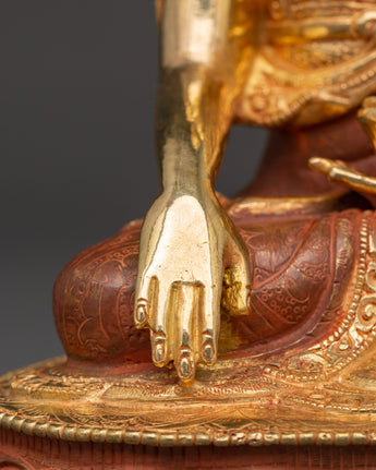 This statue depicts the Shakyamuni Buddha in the renowned earth-touching mudra, symbolizing his ultimate awakening. The painstaking craftsmanship emphasizes the placid composure and delicate detailing of his monastic garments, expressing the Buddha's dignity and tranquillity. The combination of copper and gold plating creates a stunning visual contrast, emphasizing the statue's sacredness and the depth of spiritual insight it represents.