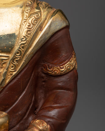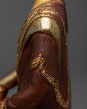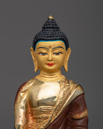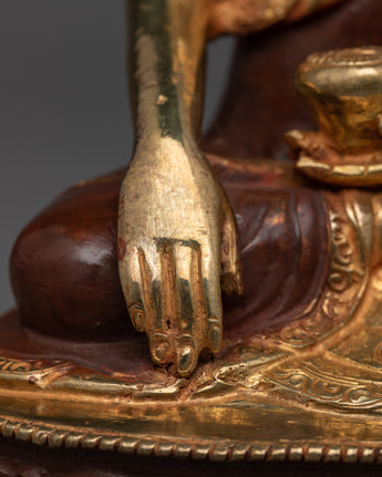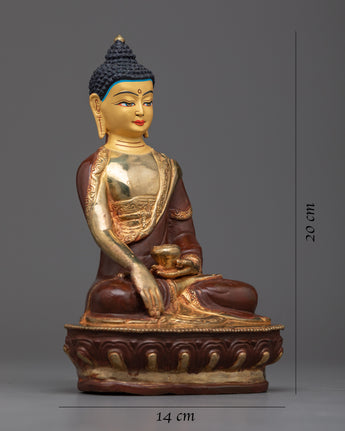 Observe the copper sculpture of Shakyamuni Buddha, a perfect representation of tranquility and divinity. This exquisite sculpture, which is 20 cm tall and is expertly crafted from copper and gilded with 24k gold, will make a meaningful addition to your sacred space.