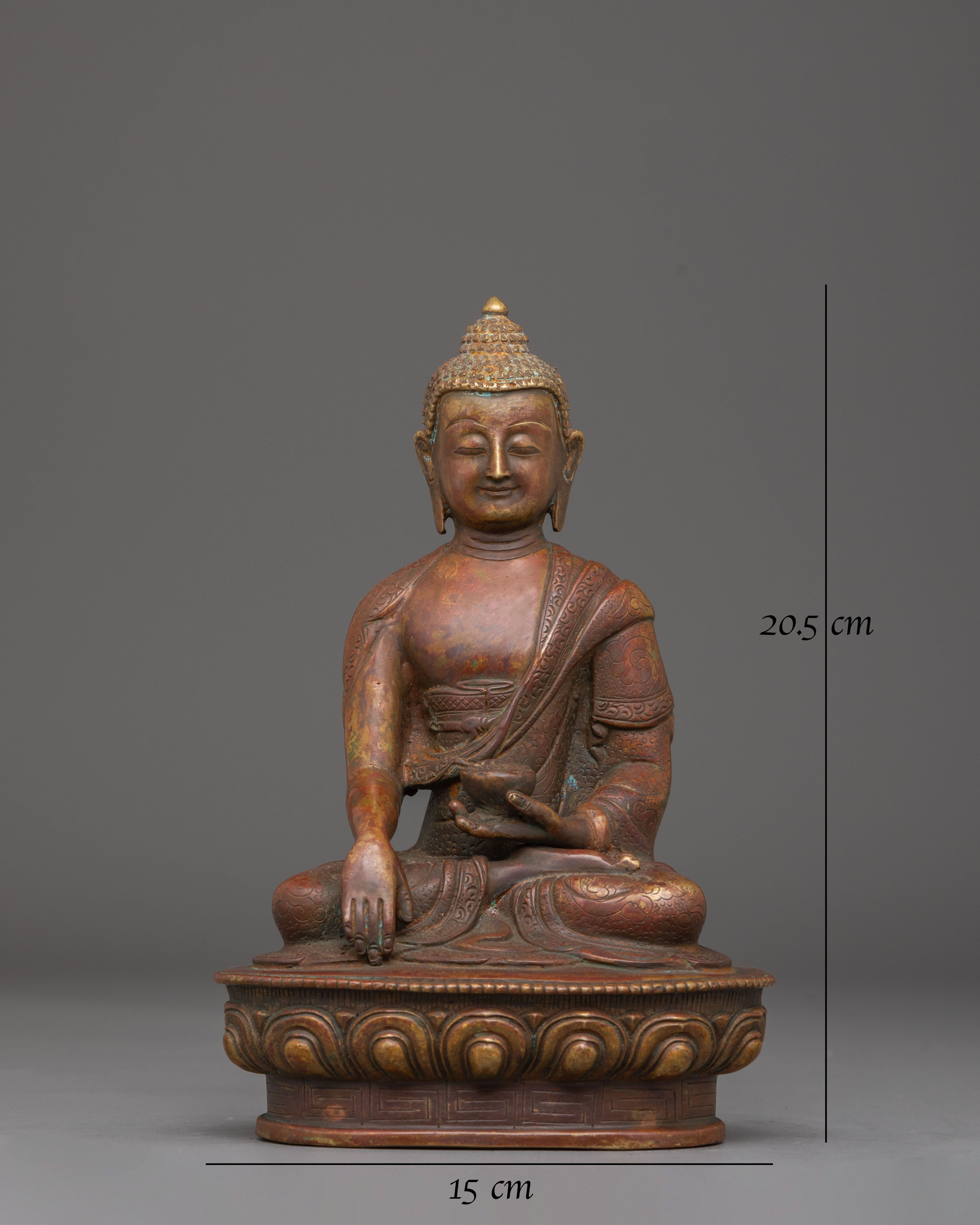 The Shakyamuni Buddha Dharma Statue is an exquisite representation of the historical Buddha, beautifully crafted from oxidized copper with an antique finish. Standing at 20.5 cm, this statue captures the Buddha in a serene meditative posture, symbolizing peace, wisdom, and enlightenment. The rich, dark tones of the oxidized copper evoke a sense of age-old tradition, making it a perfect piece for those seeking to enhance their meditation space or spiritual practice.