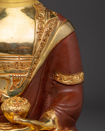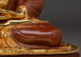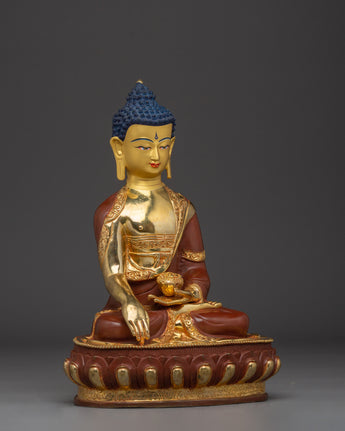 Shakyamuni Buddha is depicted in the classic meditation stance, with his right hand touching the ground in the "Bhumisparsha Mudra," indicating his enlightenment under the Bodhi tree, and his left hand holding a cup of nectar, symbolizing spiritual nourishment and purity. His tranquil expression and the beautiful artwork on his robes reveal inner serenity and knowledge. The carefully made curls in his hair and the urna symbol on his forehead represent his enlightened status.