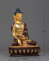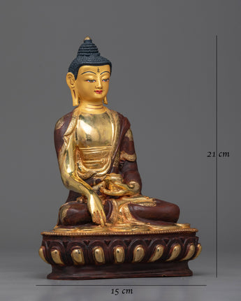Presenting our impressive Shakyamuni Buddha Gold Gilded Oxidized Statue, skillfully crafted by Nepalese artisans in Patan, as an incredible depiction of the historical Buddha. This statue, which is 21 cm (8.3 inches) tall and rests on a 15 cm (5.9 inches) base, depicts Shakyamuni Buddha in a calm and contemplative pose, representing the pinnacle of enlightenment and spiritual clarity.