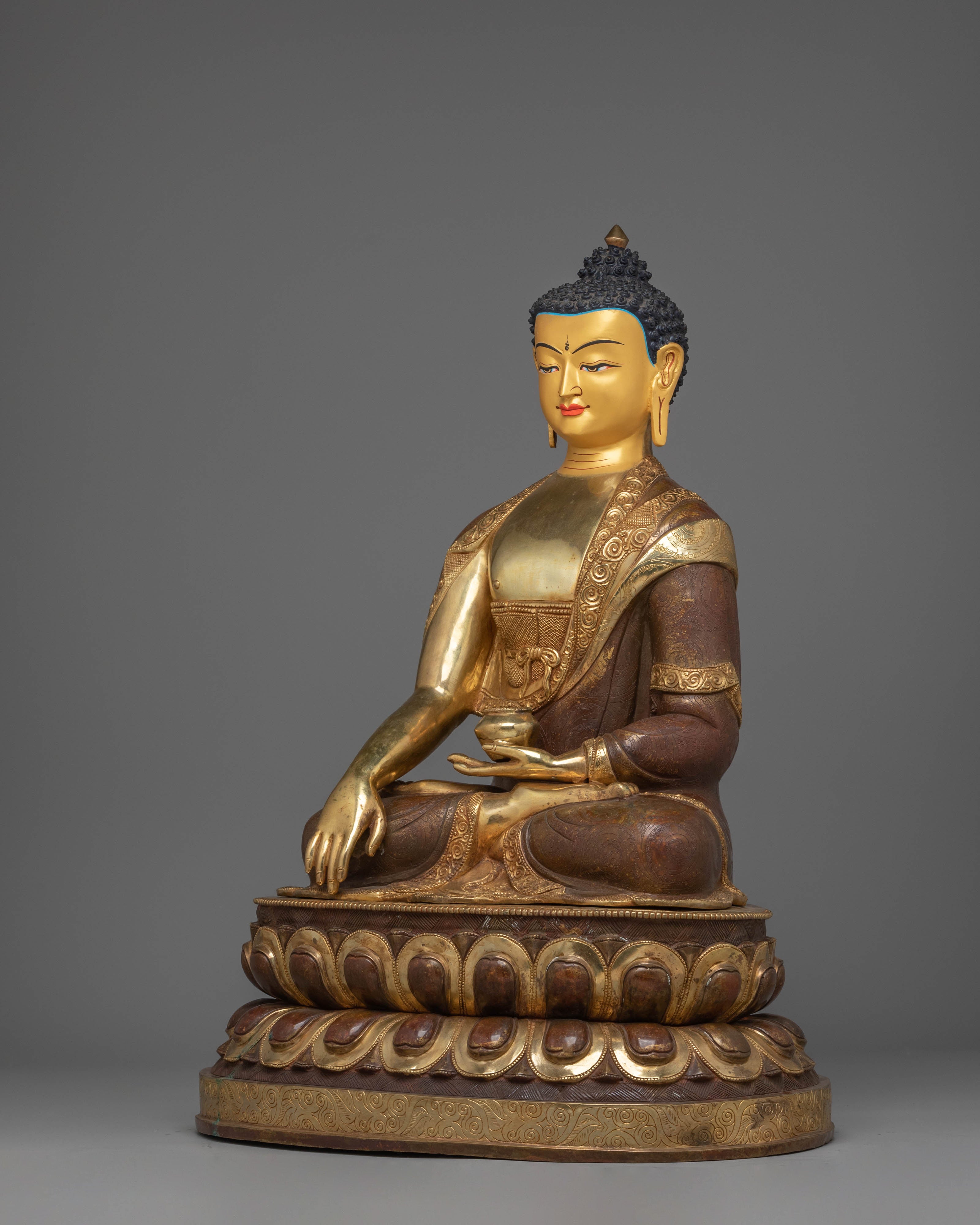 Shakyamuni Buddha is depicted seated in padmasana (lotus posture) on a lotus base, symbolizing purity and spiritual awakening. His right hand is in the bhumisparsha mudra, touching the earth to call it as a witness to his enlightenment. In contrast, the left hand holds an alms bowl, representing renunciation, compassion, and sustenance. This combination reflects the balance of wisdom and method central to Buddhist practice.