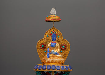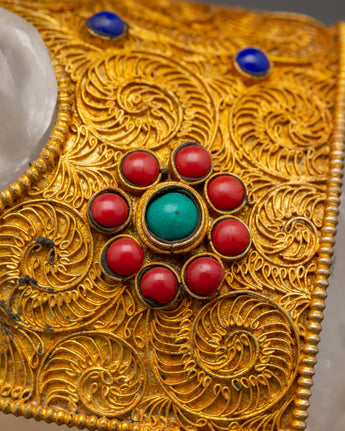 The Buddha sits gracefully on an ornately crafted throne, supported by a mighty crystal elephant representing mental power, patience, and inner wisdom. The elephant appears in a golden saddle studded with Original stones and adorned with light filigree, skillfully worked. Above the Buddha, a shining shade and a lotus-crowned finial emphasize the piece's celestial theme. The deep blue Lapis on the Buddha's face and torso represents peaceful awareness and heavenly energy, and the coral and turquoise stones represent energy and spiritual protection. Everything about this sacred sculpture, from the flowering base to the incredible mandorla, exudes Himalayan elegance and devotion.
