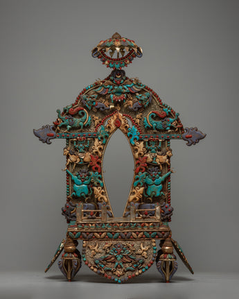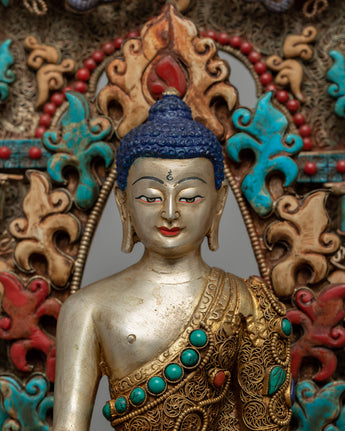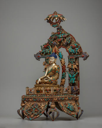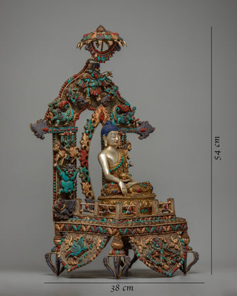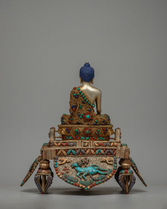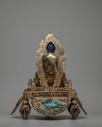 A magnificent work of art, the Shakyamuni Buddha on Throne Statue radiates serenity and spiritual grace. This statue, which was carefully carved by hand, perfectly embodies enlightenment and calm. Filled with lapis lazuli, coral, and turquoise gemstones, this exquisitely crafted copper object exudes a sense of sacred presence and respect.