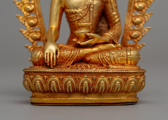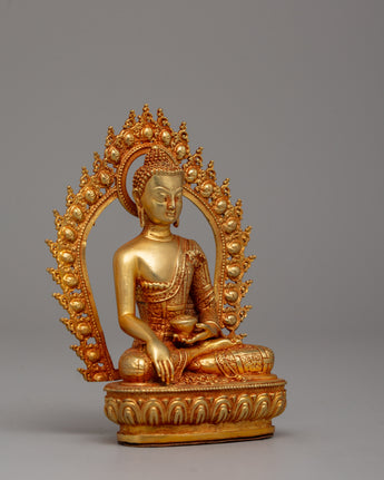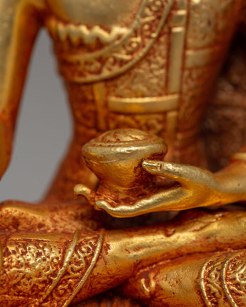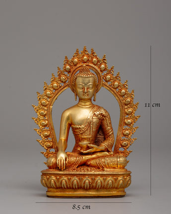 The Shakyamuni Buddha rulers of the Shakya clan statue is meticulously crafted from copper and finished in gold, highlighting its divine presence and intricate detailing. It measures 11 cm in height and 8.5 cm in width and depicts the Buddha in a meditative pose while seated on a beautifully designed lotus pedestal. His right hand is extended in the Bhumisparsha Mudra, symbolizing the moment of enlightenment, and his left hand is holding a traditional alms bowl, representing wisdom and compassion.