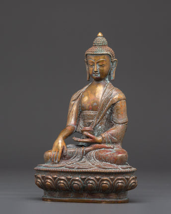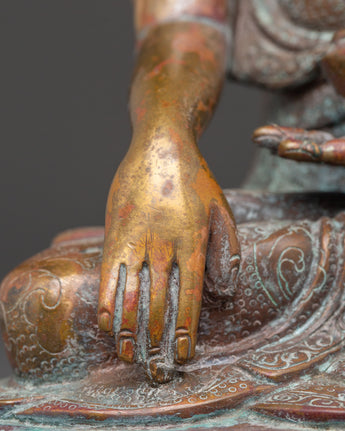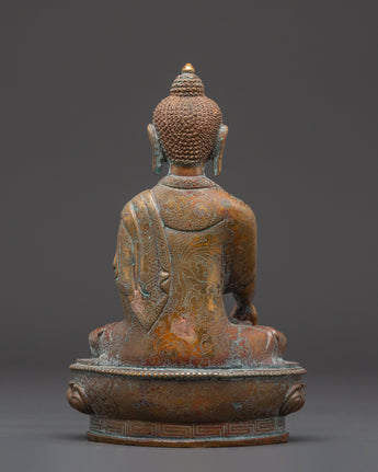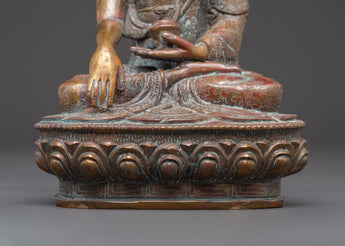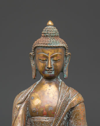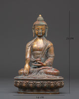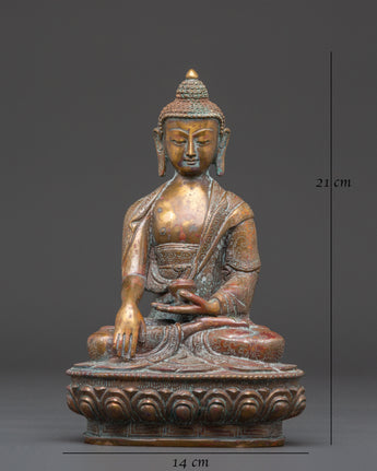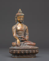 Shakyamuni Buddha's Sacred Statue is a potent emblem of serenity, enlightenment, and divine wisdom. Handcrafted from copper by talented Himalayan artisans, this statue captures the serene essence of Shakyamuni Buddha, the founder of Buddhism. The Bhumisparsha Mudra, also known as the "Earth Touching Gesture," depicts the Buddha's moment of enlightenment beneath the Bodhi tree, inviting the earth to witness his knowledge of truth. This sacred artwork will look great on your Buddhist altar, meditation area, or in a tranquil house.