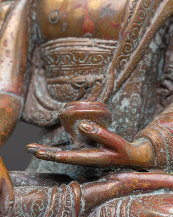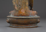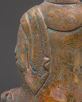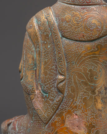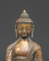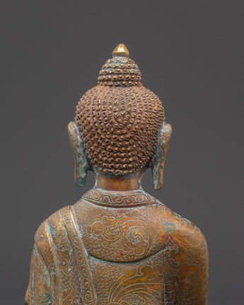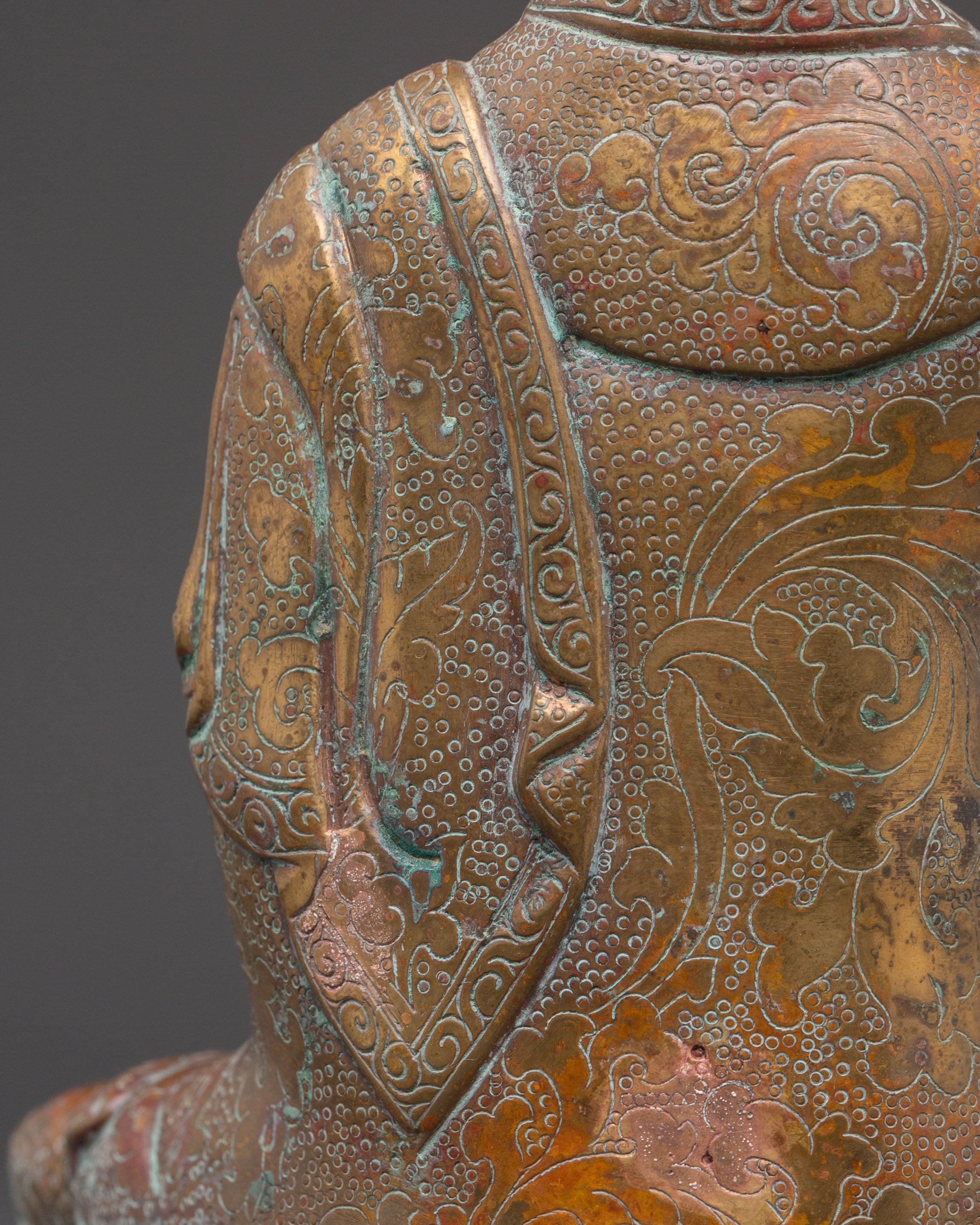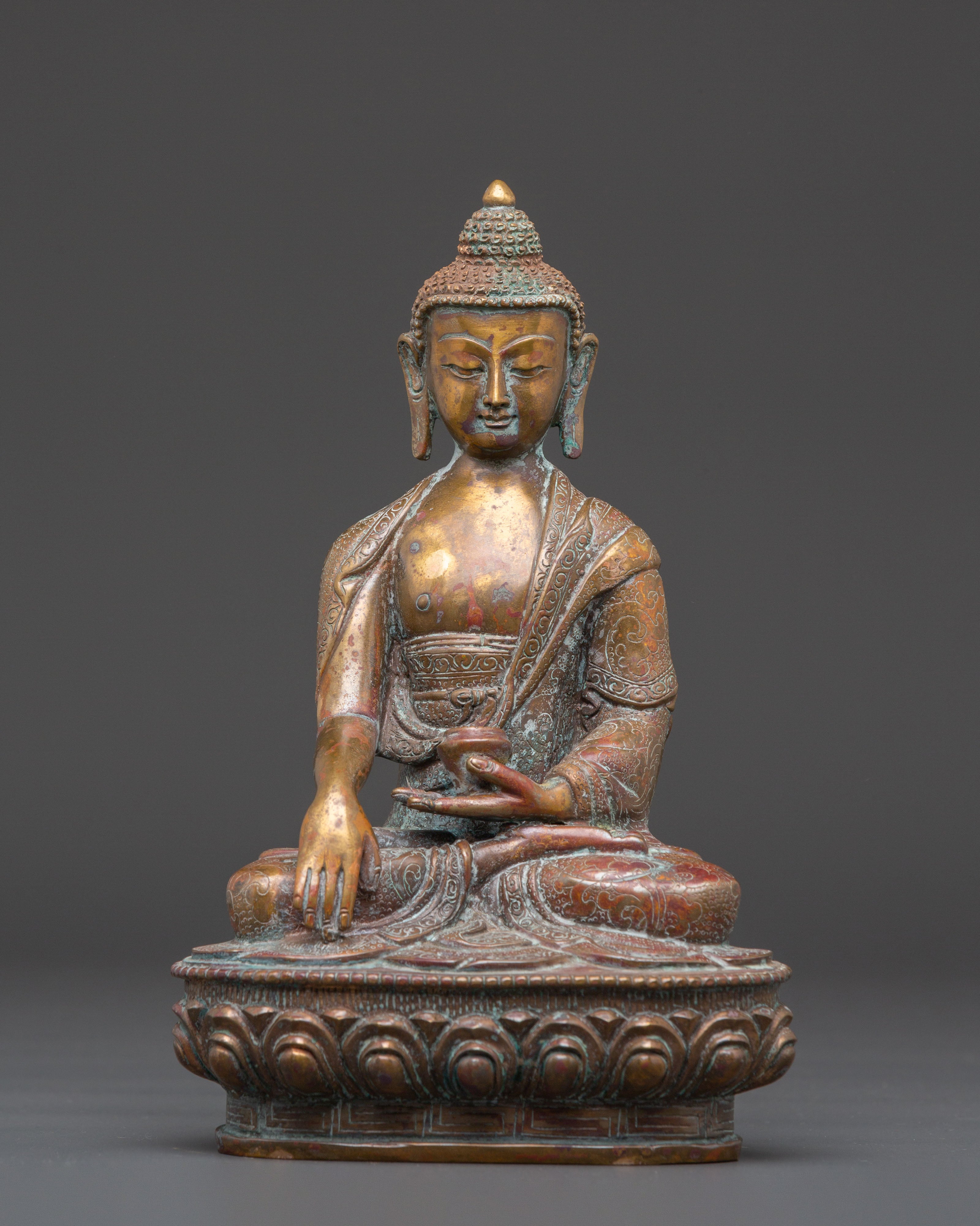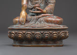 Every aspect of this copper monument exemplifies skill and devotion. The Buddha sits gently atop a double-lotus pedestal, which is a traditional sign of purity and spiritual awakening. His placid visage, lengthened earlobes, and delicately carved robe covered with delicate floral designs exude calm and attentiveness. The polished copper body emanates warmth and depth, and the natural patina enhances its timeless appeal. Each curve and shape has been skillfully carved to represent the profound silence and presence of Shakyamuni Buddha.
