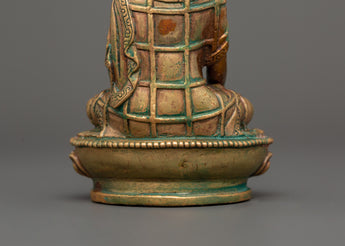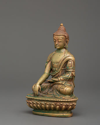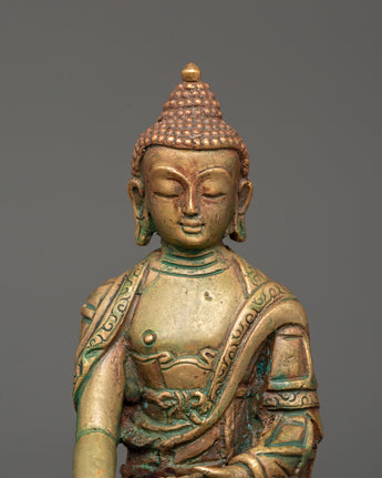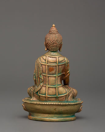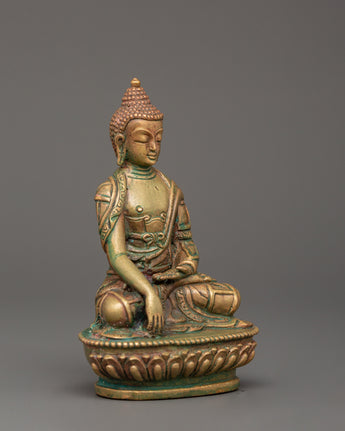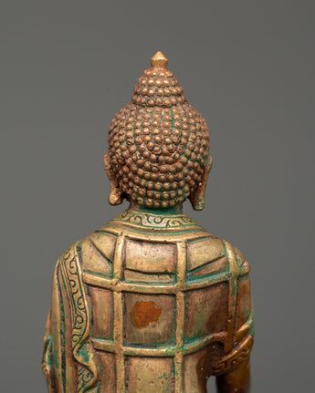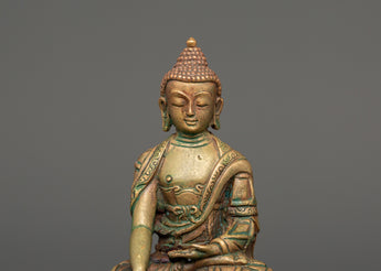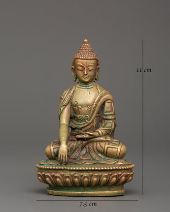 This 11 cm tall and 7.5 cm broad statue of Shakyamuni Buddha, revered as a spiritual teacher, embodies the Buddha's peaceful and profound teachings. Weighing just 0.29 kg, it is perfect for any altar, meditation space or as a gift to encourage spiritual growth. The statue is crafted from oxidized copper and features a stunning gold-plated finish, enhancing its elegance and timeless appeal. Shakyamuni Buddha, often regarded as the spiritual teacher, represents enlightenment and the path to inner peace.