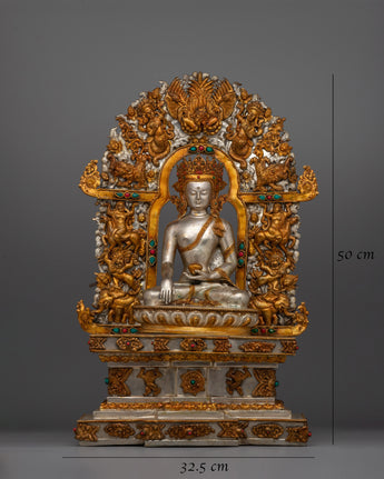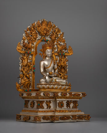 A magnificent example of Buddhist art, this Shakyamuni Buddha statue is painstakingly carved on a copper body and embellished with electrogold and silver plating. Intricate coral and turquoise inlays further complement the statue, giving it a feeling of regal splendor and mystical vitality. The statue of the Buddha represents enlightenment and inner serenity. The Buddha is seated on an enormous throne and is shown in a calm state of concentration. The statue is a work of art to be treasured rather than just a religious emblem because of its intricate detail, showcasing talented craftspeople's artistry.