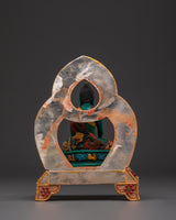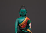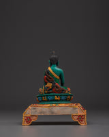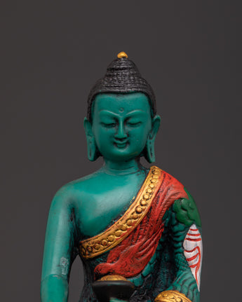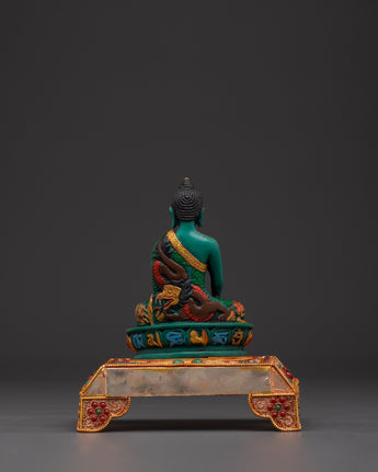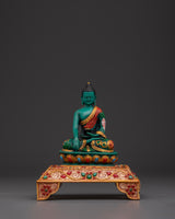 The statue has beautiful filigree work and is embellished with colorful artificial stones such as turquoise and coral, contributing to its visual appeal and spiritual importance.  The golden halo signifies the Buddha's aura of knowledge and compassion, while the lotus seat base symbolizes purity and spiritual enlightenment. This Buddhist altar decoration provides a focal point for meditation and adds cultural and spiritual depth to any environment. The vibrant hues of the inlaid stones are consistent with Tibetan artistic traditions, depicting a beautiful balance of attention and inner calm. This Shakyamuni Buddha Statue is ideal for collectors and practitioners, representing the road to enlightenment and serving as a reminder of the path of compassion and wisdom.