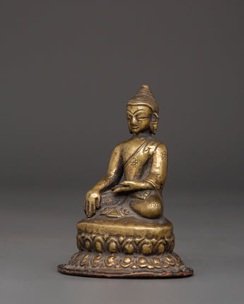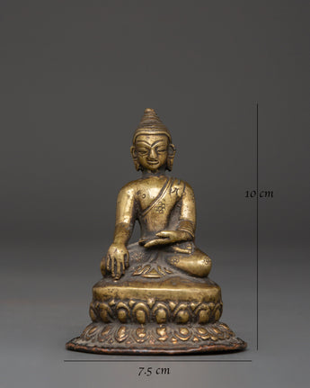 This magnificent Shakyamuni Buddha Statue with Throne is an exceptional work of craftsmanship and spiritual significance. The statue measures 10 cm in height and 7.5 cm in width, weighing 0.28 kilograms. The brass figure, which is gold-plated, is finely crafted and rests on a copper throne with a beautifully carved wood base, enhancing both its visual and spiritual presence. The throne, standing 24 cm tall and 18 cm wide, represents regal tranquility, making it a stunning focal point for any altar, meditation space, or sacred room.